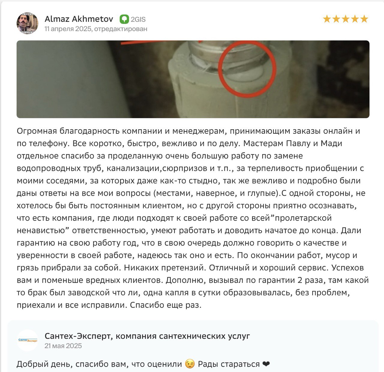 Огромная благодарность компании и менеджерам, принимающим заказы онлайн и по телефону. Все коротко, быстро, вежливо и по делу. Мастерам Павлу и Мади отдельное спасибо за проделанную очень большую работу по замене водопроводных труб, канализации, сюрпризов и т.п., за терпеливость в общении с моими соседями, за которых даже как-то стыдно, так же вежливо и подробно были даны ответы на все мои вопросы (местами, наверное, и глупые). С одной стороны, не хотелось бы быть постоянным клиентом, но с другой стороны приятно осознавать, что есть компания, где люди подходят к своей работе со всей ответственностью, умеют работать и доводить начатое до конца. Дали гарантию на свою работу год, что в свою очередь должно говорить о качестве и уверенности в своей работе, надеюсь так оно и есть. По окончании работ, мусор и грязь прибрали за собой. Никаких претензий. Отличный и хороший сервис. Успехов вам и поменьше вредных клиентов. Дополню, вызывал по гарантии 2 раза, там какой то брак был заводской что ли, одна капля в сутки образовывалась, без проблем, приехали и все исправили. Спасибо еще раз.