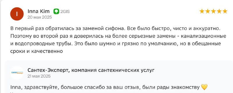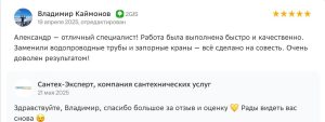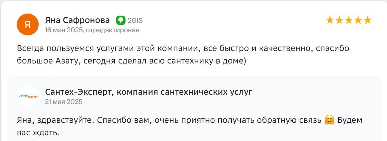 Большое спасибо мастерам Сантех-Эксперт, особенно Алексею и Александру. В первый раз вызывала ребят в октябре 2024 года. И вот сегодня приходили вновь. Радует наличие нужных инструментов (особенно в сравнении с сантехником КСК, у которого нет даже пакли и отвертки с собой), профессиональный подход и то, что не уходят не доделав до конца или по достижению этапа “и так сойдет”. Всегда добиваются полного устранения течи, проверяют, всё ли чётко. В общем, молодцы. Очень хочется обращаться к сантехникам пореже, но если придётся, то только к ним.