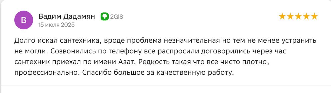По вопросам сантехники с 2018 года обращаюсь исключительно к Азату и Азамату – все быстро, профессионально, чисто, с отличным результатом. Все запчасти и расходники с собой, большой набор профессиональных инструментов для решения любых задач, даже нестандартных. Кому нужен в итоге результат, а не то как с ним/с ней по телефону поговорили, рекомендую обращаться к ребятам.